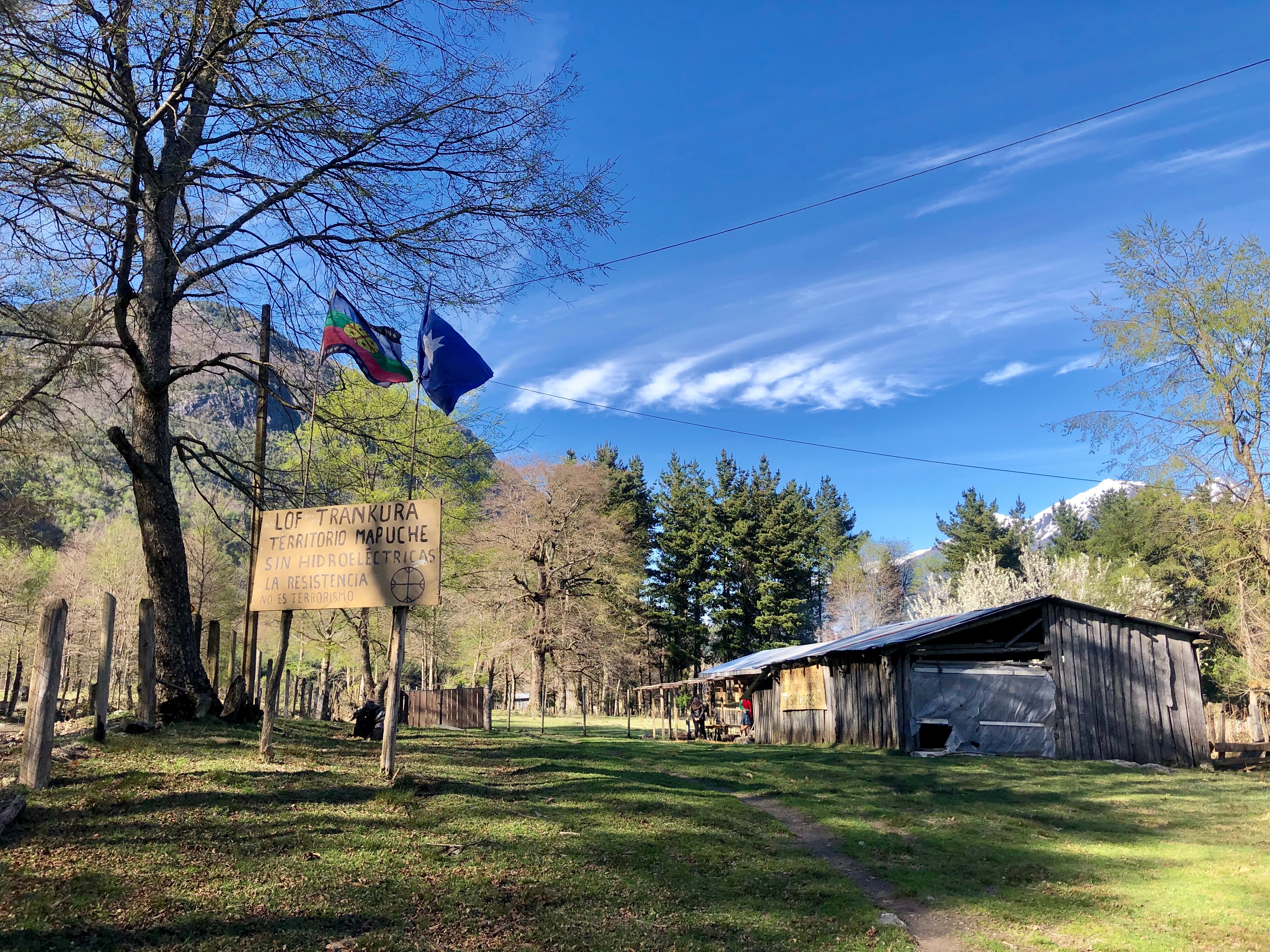 A meeting cabin for leaders. On the left, you can find two flags. The one on the left is the flag of Chilean Mapuche, and the one on the right is the ancestral flag.
